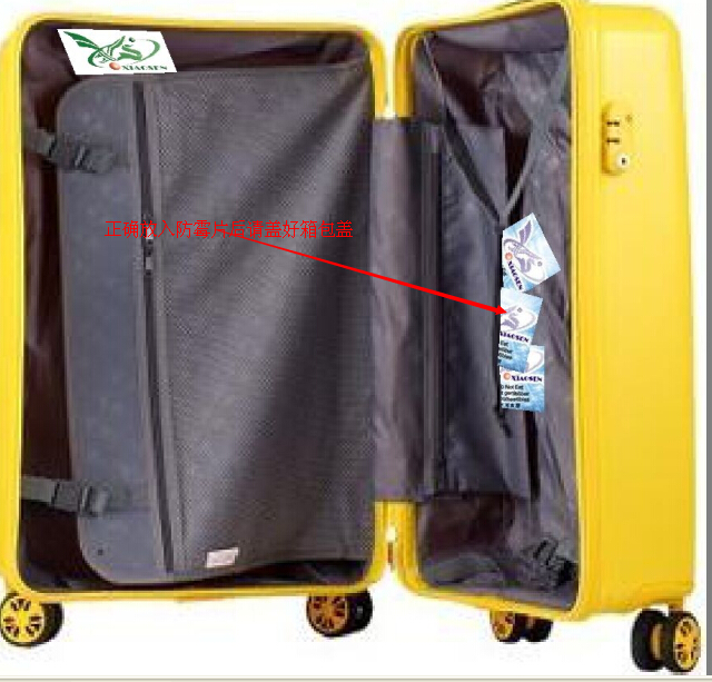 2)蓋好箱蓋后,因箱包外套PE袋或者外箱(紙盒),可以在PE袋子內(或紙盒)內也放置兩到三片防霉片,可預防箱包在倉儲或者海上長時運輸發(fā)霉長斑。